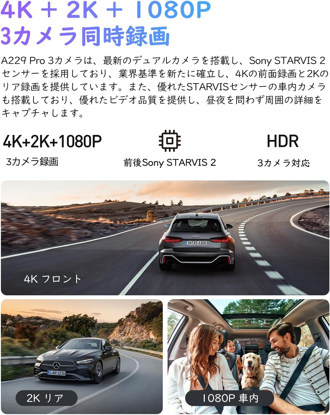 | 解像度(代表例) | フロント:4K(3840×2160)/ リア:2K(2560×1440)/ 車内:1080P(1920×1080) |