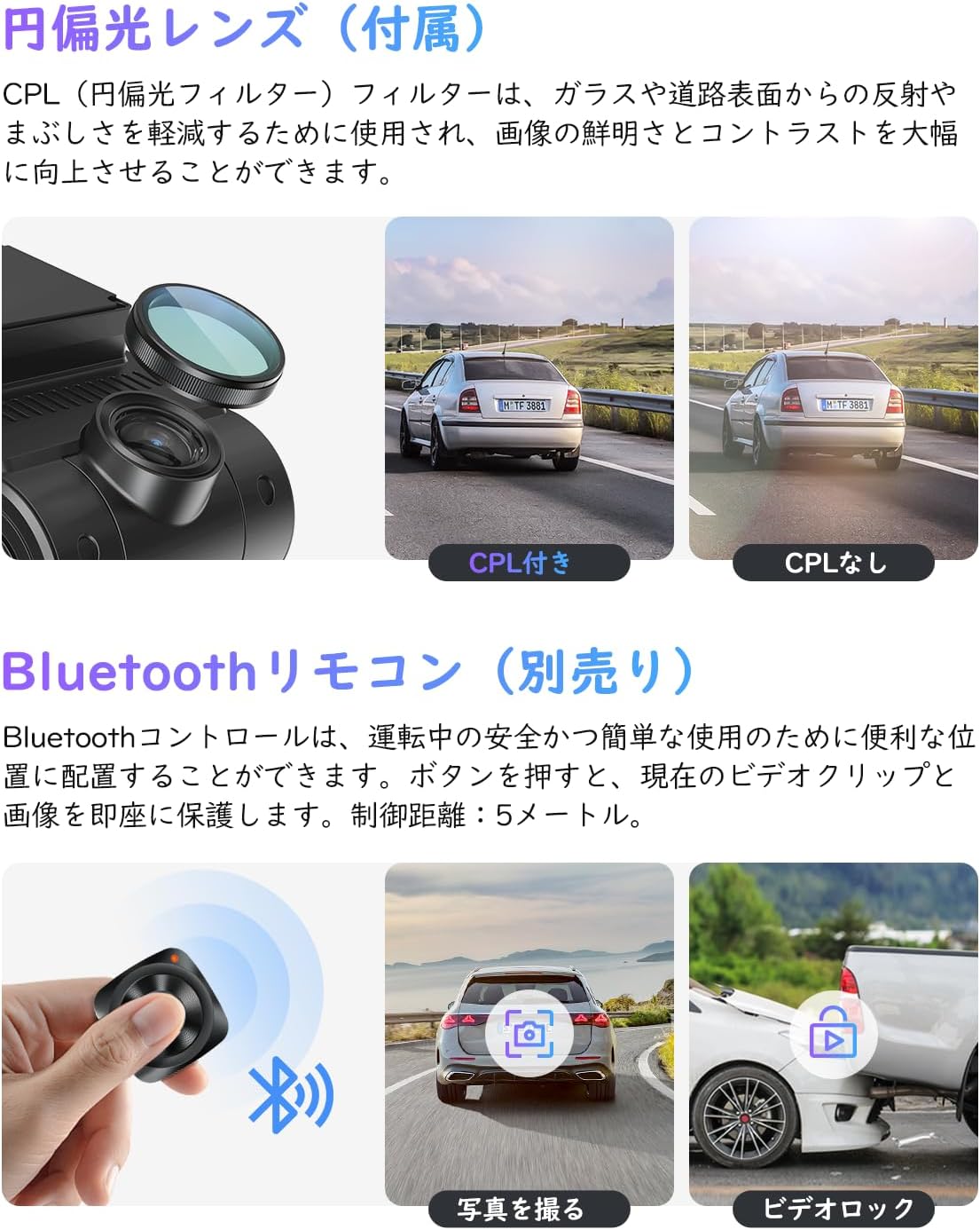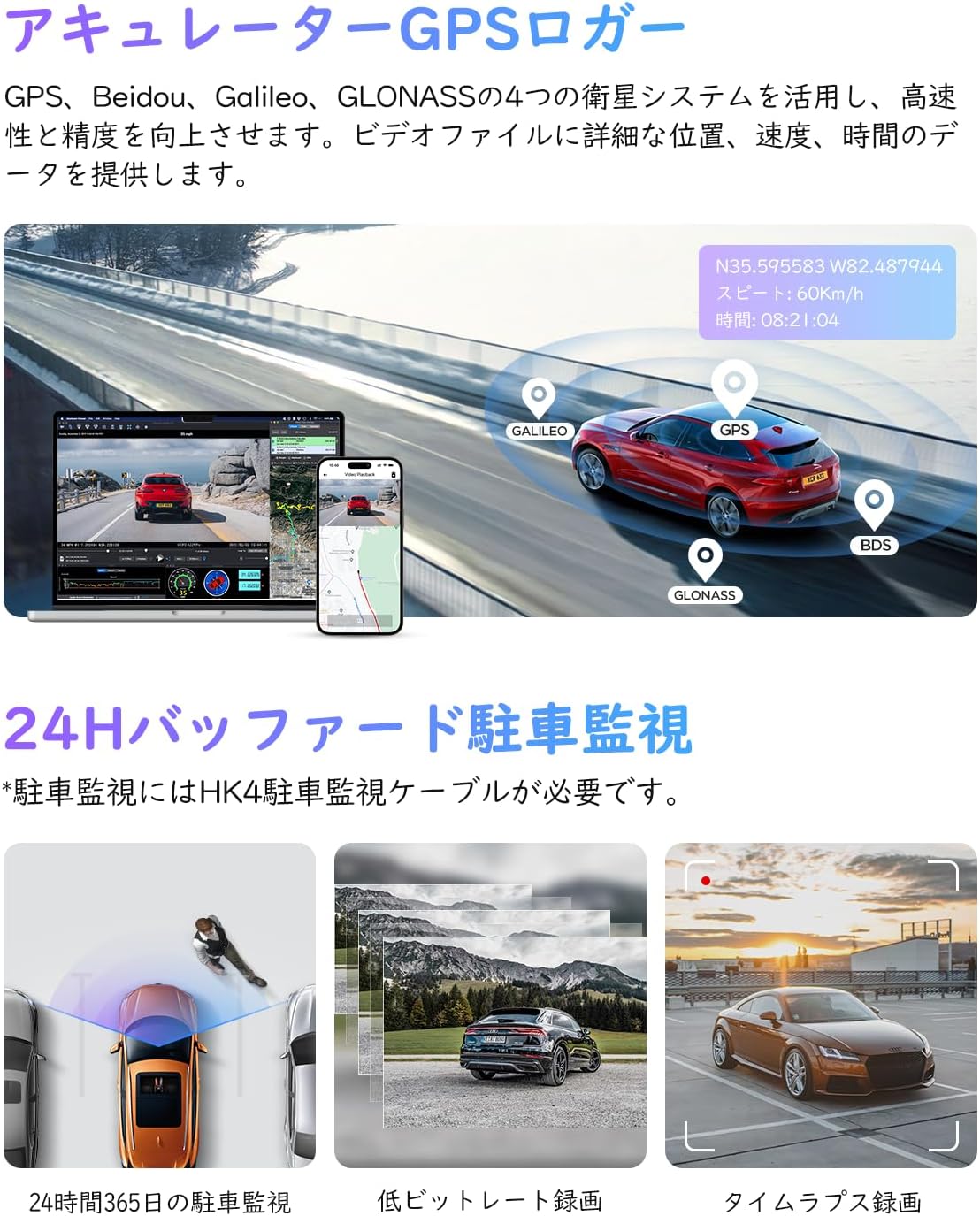 フロント4K+リア2K+車内1080Pの3CH構成で、日常の“残したい瞬間”を広くカバーします。
