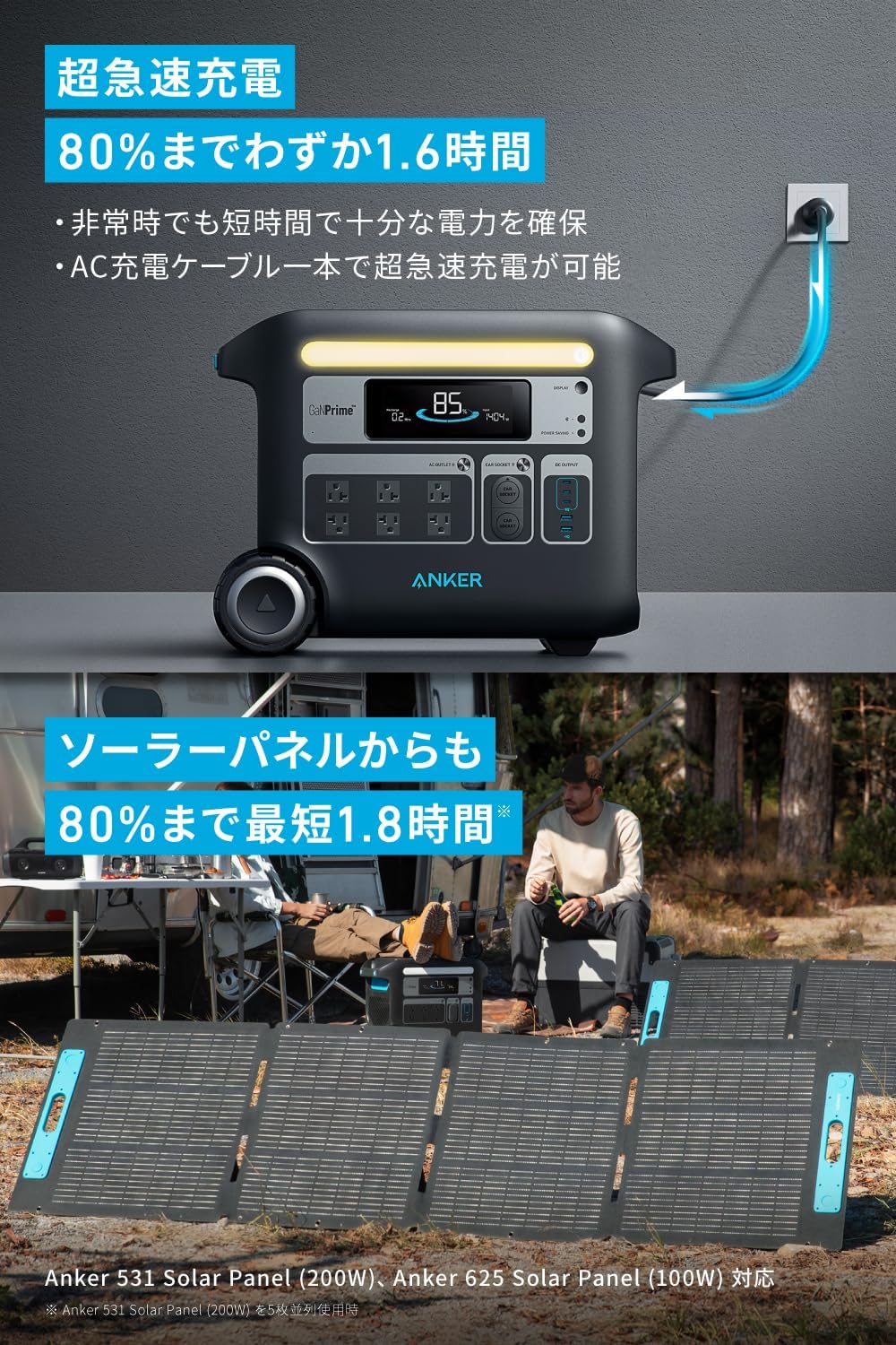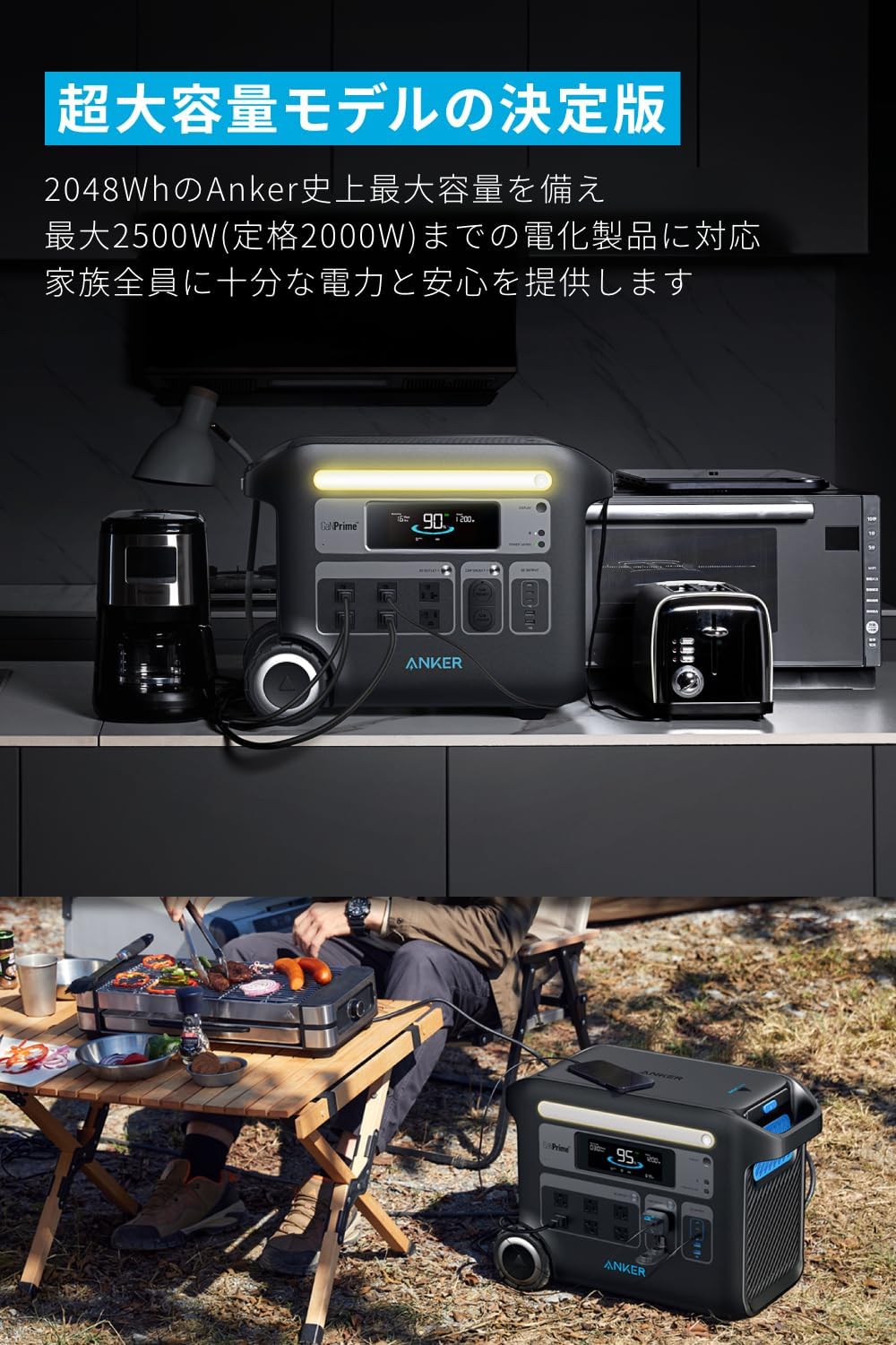 Anker 767は、容量2048Wh・定格2000Wの2kWh級で、ファミリーキャンプの「我慢」を減らしやすいモデルです。