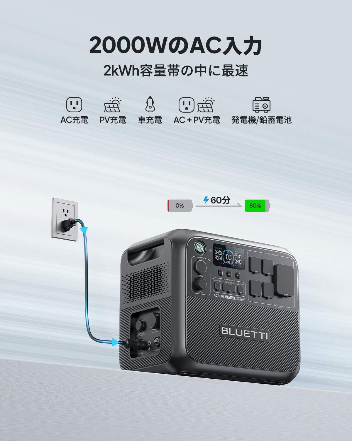 BLUETTI AC200Lは、「電源が足りない不安」を容量で減らしたいファミリーに向く2kWhクラスです。