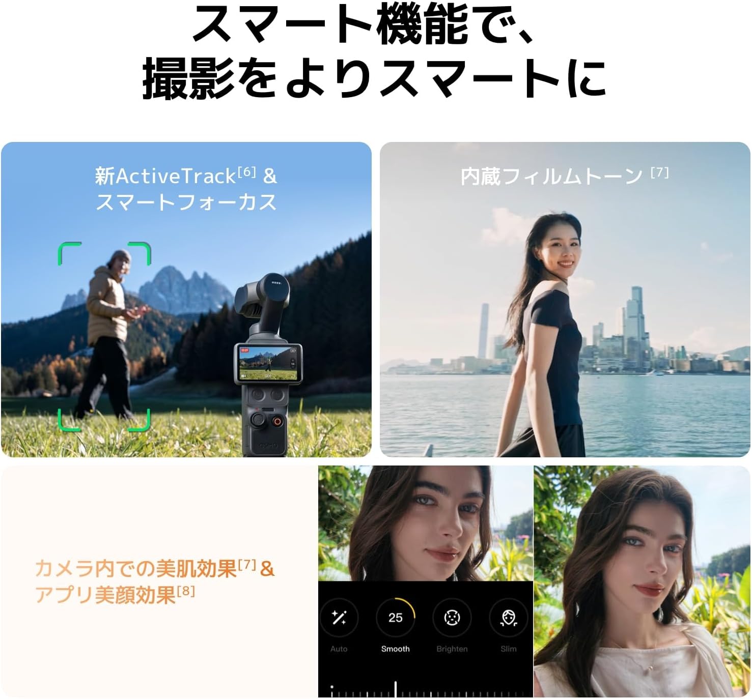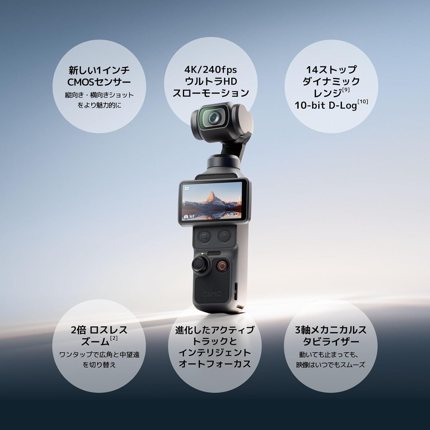 DJIのポケットシリーズは、コンパクトなボディに3軸機械式ジンバルを搭載し、スマートフォンでは実現できないなめらかな映像安定化を実現する製品です。