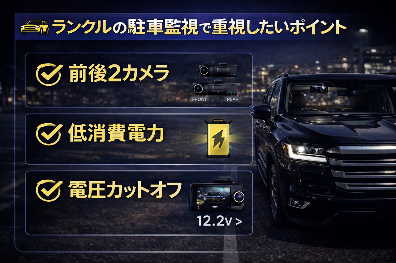 駐車場トラブル対策として、駐車監視付きドラレコはランクルオーナーにとって心強い装備です。